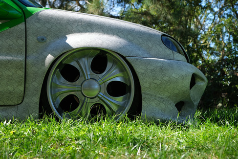 EXTERIOR: Suicide Doors • D-Class Snakeskin exterior full retrim • Veilside front bumper and side skirts shortened to fit • Custom built rear bumper • Smoked rear lights • Neon ground kit • Modified and extended bonnet • Smooth boot • Fuel cap relocated behind driver’s seat • Door moulds smoothed in • Wide arch extensions • Single wiper conversion • Custom built mirrors